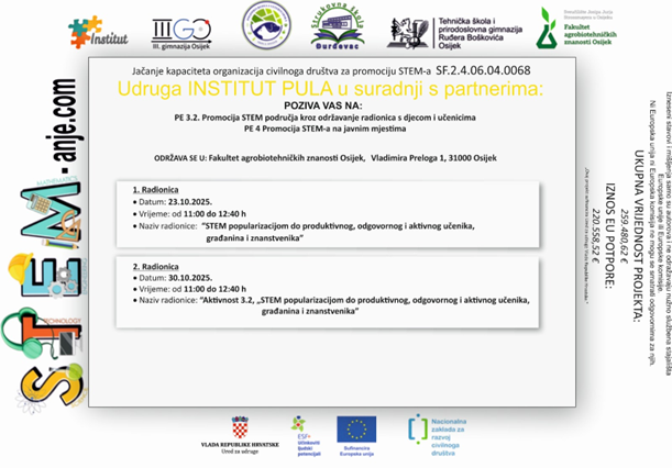 U listopadu 2025. održat će se dvije radionice naziva „STEM popularizacijom do produktivnog, odgovornog i aktivnog učenika, građanina i znanstvenika“.