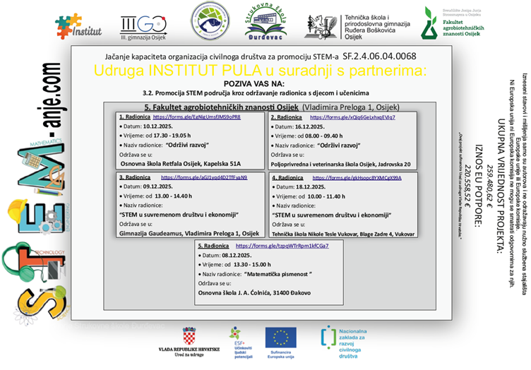 16.12.2025. radionica „Održivi razvoj“, mjesto održavanja - Poljoprivredna i veterinarska škola Osijek, Jadrovska 20; od 8,00-9,40, prijava putem linka https://forms.gle/xQiq6GeLxhxqEVJq7